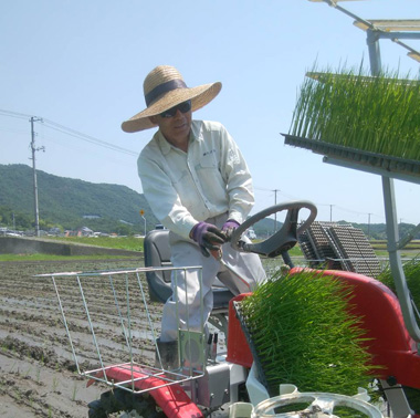 稲つくりは、「苗で決まる」と言われております。無農薬栽培の場合は、特に丈夫な、病気に掛からない強い苗を育てることが、基本です。私は、強い苗を育てるために、みのる産業の田植機(ポット苗)を採用しています。みのる産業は、日本では、一番大きい苗を植えることができるから。